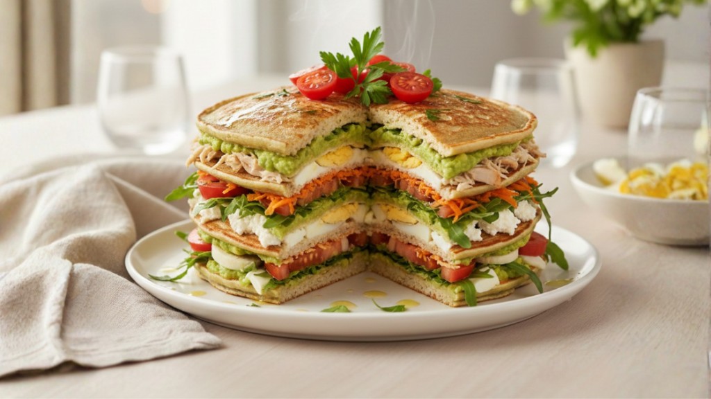 - Armar la torre alternando: panqueque → relleno → vegetales.